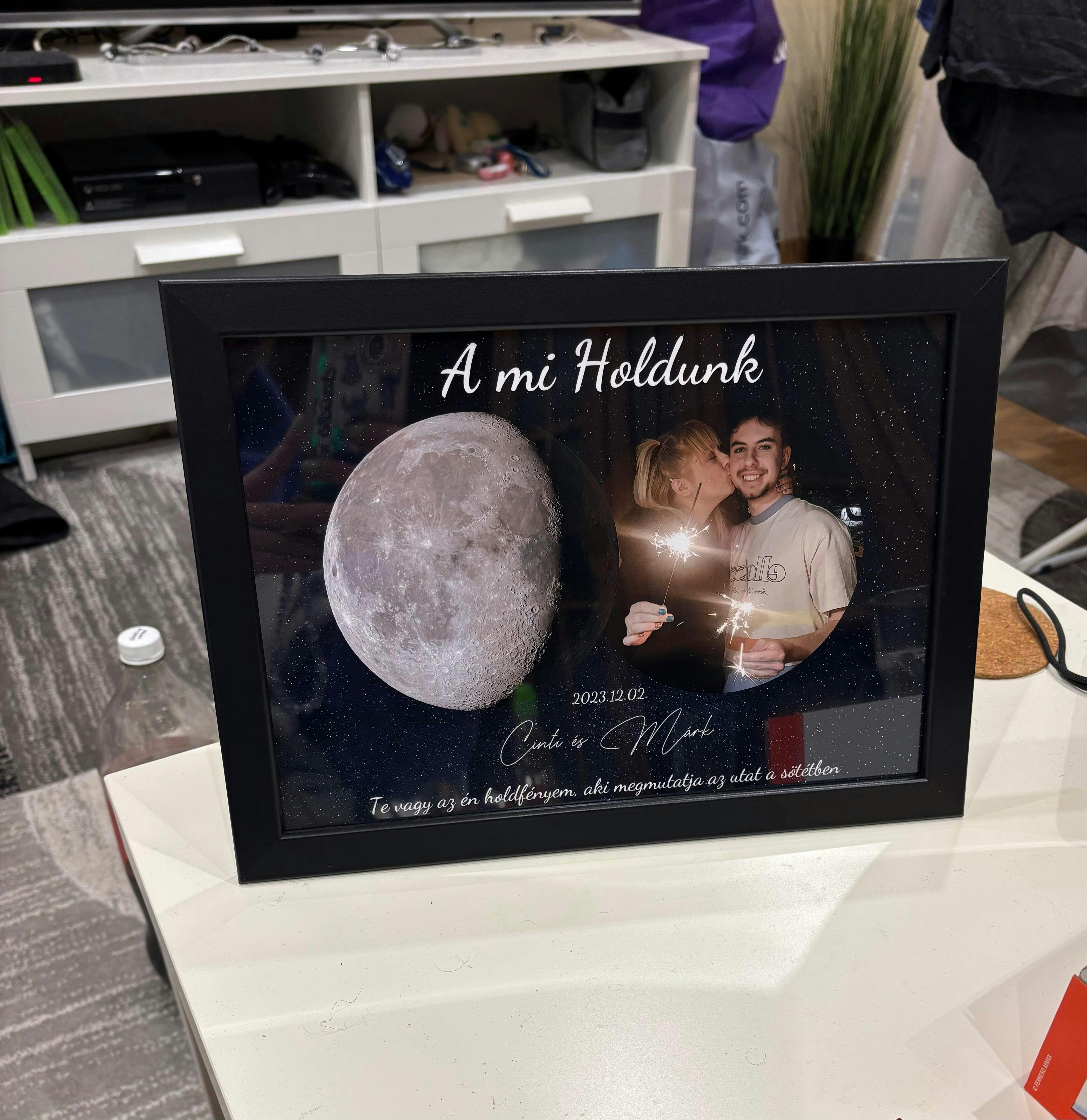 Őrizd meg a szerelmetek kezdetének dátumát egy egyedi képes holdfázis faliképpel – romantikus és különleges ajándék pároknak!