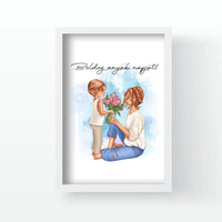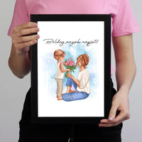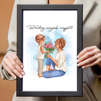 Ha egy emlékezetes és személyes ajándékot keresel Anyák napjára, ajánljuk figyelmedbe az Anyák napi faliképünket, amelyen egy gyerek látható, aki egy szép virágot ad át az anyukájának.