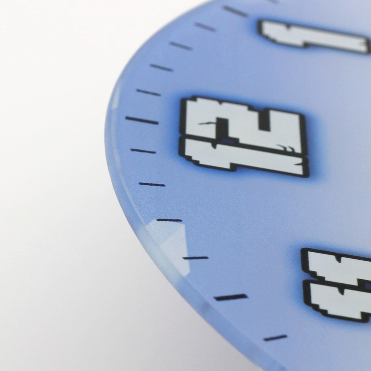 A kép csak illusztráció, a kész termék némiképp eltérhet a grafikától. Az elkészült órán minden esetben van egy 5 mm-es perem, a színe az üveg anyagából fakadóan enyhén zöldes árnyalatú.
