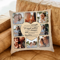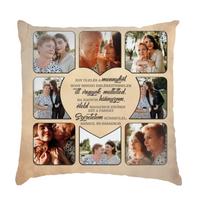 A párna letisztult és elegáns stílusban készül, puha tapintású anyagból, hogy a mindennapokban is békét és szeretetet sugározzon. A fotók elrendezése harmonikus, így a párna nemcsak praktikus, hanem esztétikus fotós emléktárgy is.